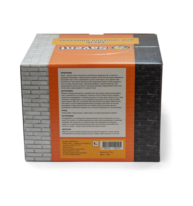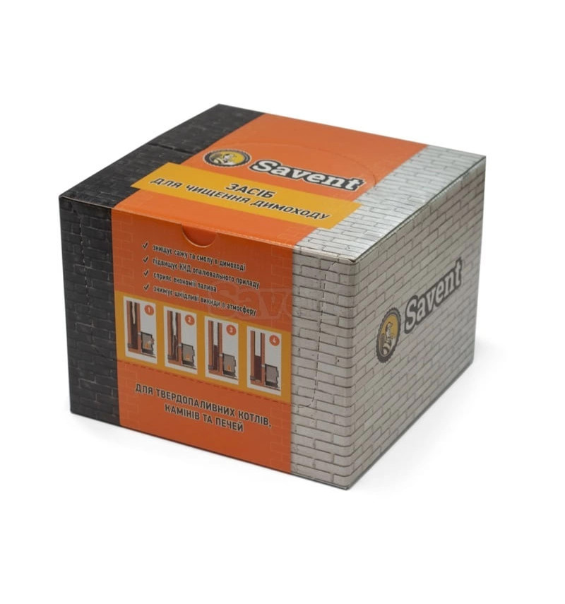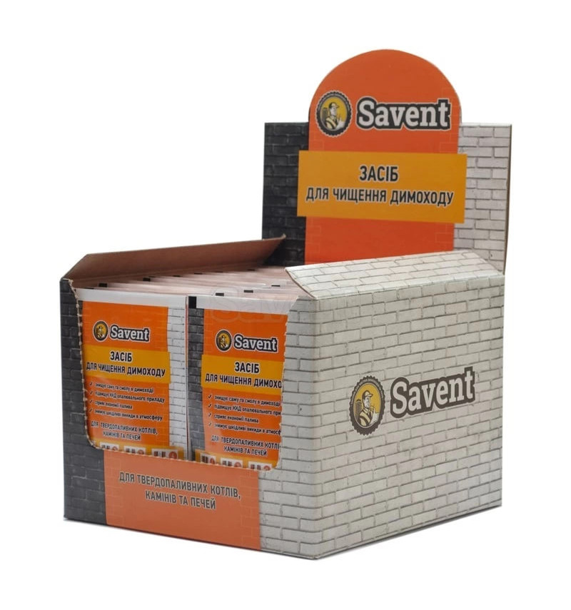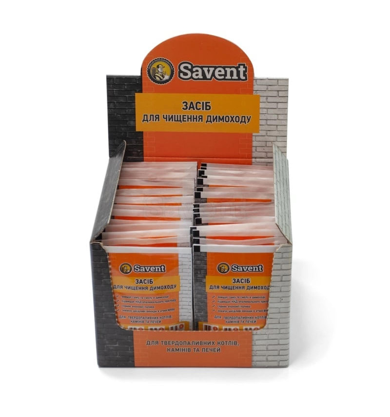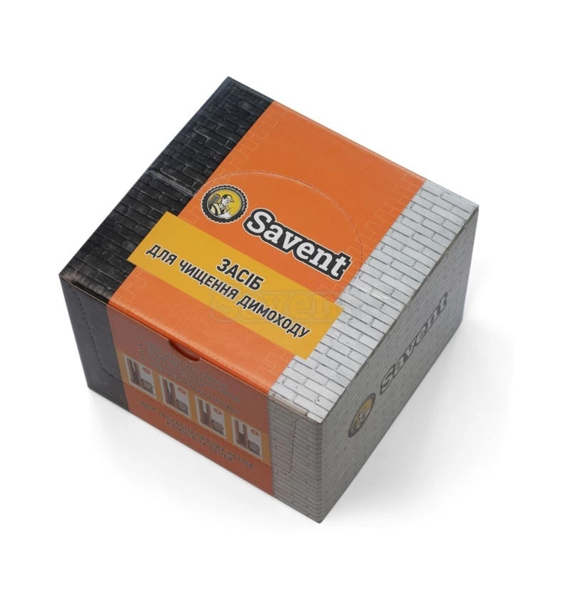 Уникальное средство для немеханической очистки дымоходов и твердотопливных приборов – Savent! Этот порошок нового поколения обладает каталитическим действием, способствующим разрыхлению сажи и смолы, превращая их в пепел, после чего они безопасно оседеют.