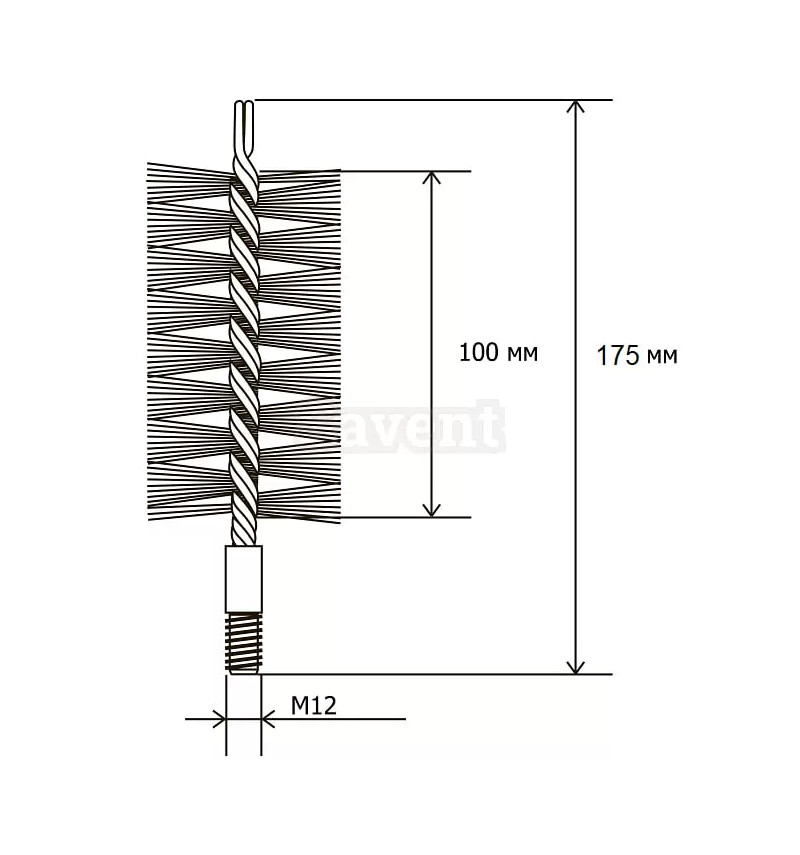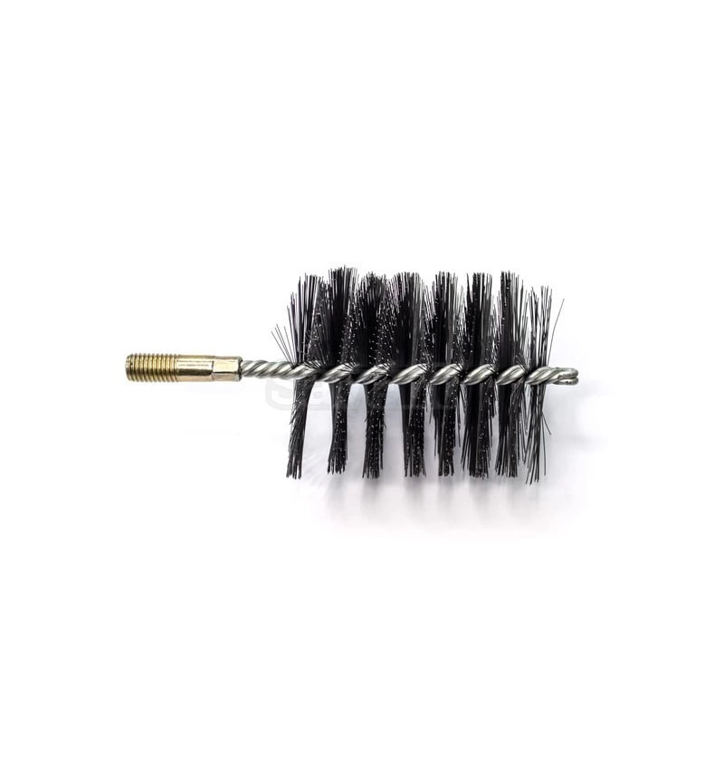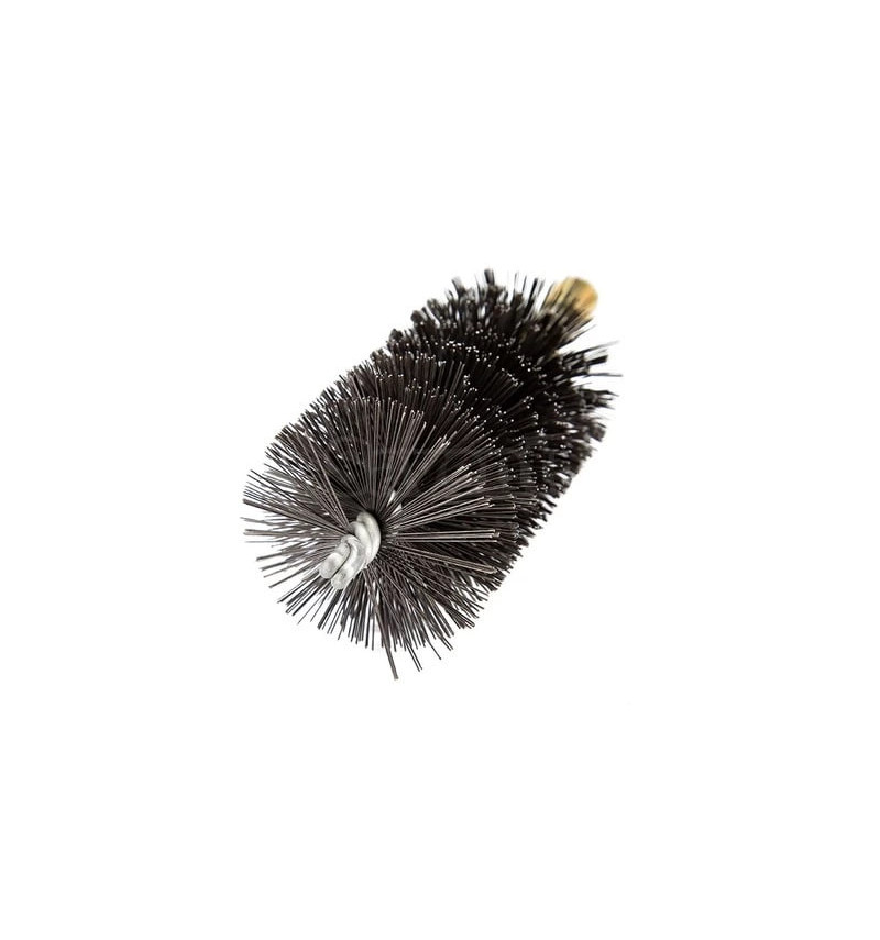 Ворс щетки изготовлен из оксидированной пружинной проволоки диаметром 0,3 мм, которая зажата между четырьмя оцинкованными стержнями диаметром 2,8 мм. Это обеспечивает прочность и эффективность щетки при удалении отложений. Сама щетка имеет резьбовое соединение М12, что позволяет крепить ее к специальной ручке для удобства использования.