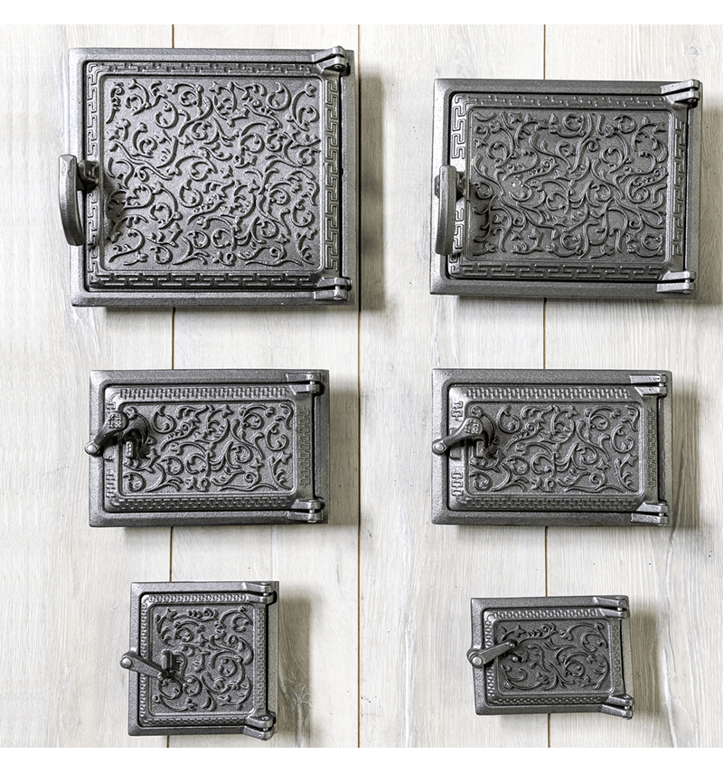 Комплект дверец из чугуна для кирпичных печей. Красивый орнамент из завитушек подойдет для разных стилей печей - как простые обогревательные, так и большие печи.