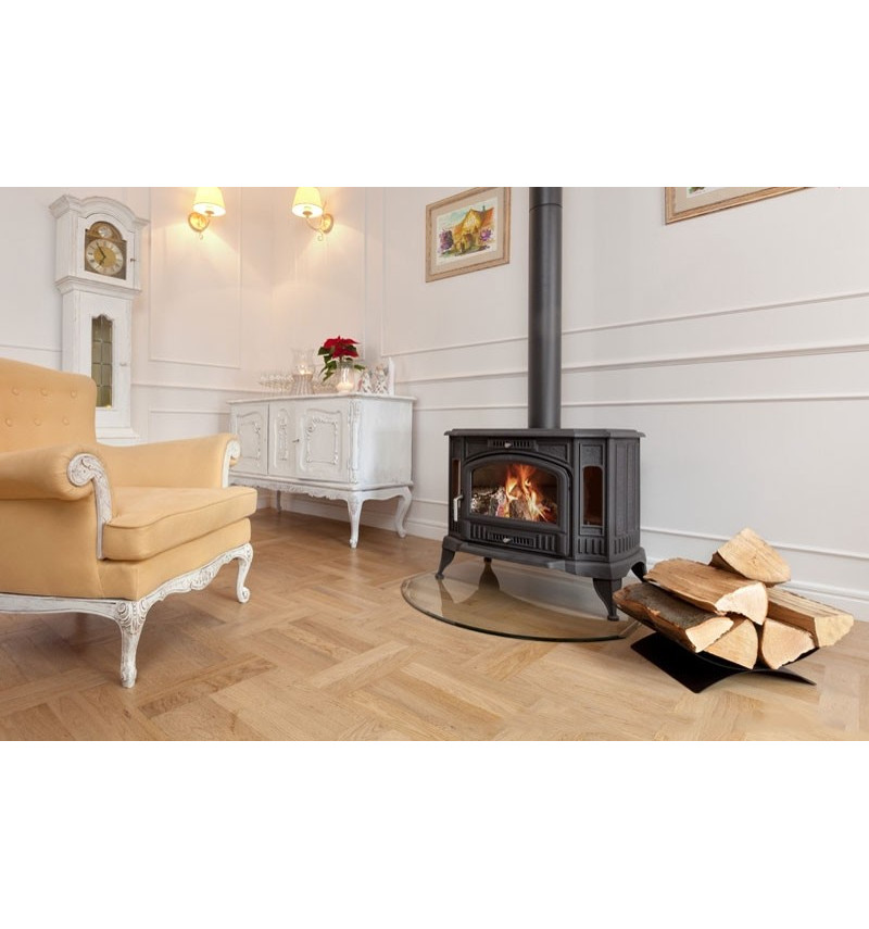 Вес конструкции составляет 160 кг, поэтому рекомендуем перед покупкой подготовить место для установки печи. Отличительной чертой этой модели является возможность обзора огня одновременно с трёх сторон. Жаропрочное защитное стекло без проблем выдерживает высокие температуры. Благодаря двойным стенкам, печь долго остывает, отдавая тепло в течение нескольких часов после полного сгорания топлива. Дверная ручка съёмная: она не будет нагреваться в процессе работы печки.