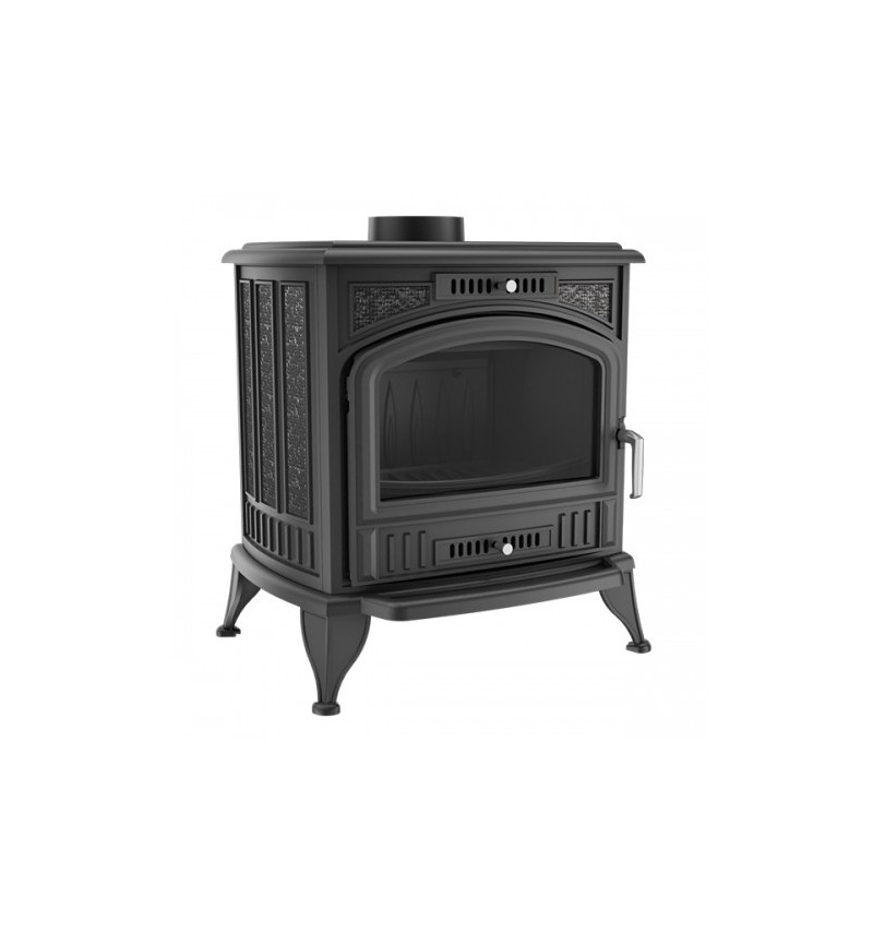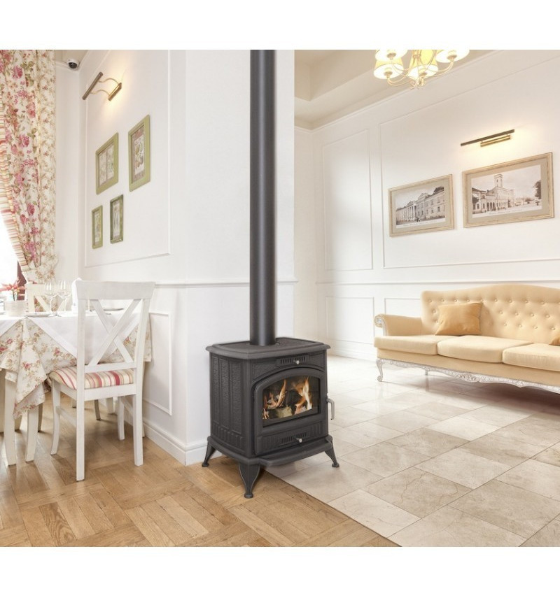 Печь этой модели имеет мощность 8 кВт, вес 120 кг, габариты 630х578х490 мм, предназначена для отопления дачных домиков и небольших коттеджей площадью не более 100 кв. м. Топка печи выполнена из чугуна, к верхней или задней стенке, которой можно подключить дымоход диаметром 130 мм. Имеется регулировка подачи воздуха на стекло прямой формы, изготовленное из термостойкой керамики. Это стекло вмонтировано в дверцу арочной формы, ручка которой не нагревается. Через него есть возможность наблюдать за игрой языков пламени, представляя, что находитесь у открытого огня. Изделие снабжено удобным зольным ящиком, который очень легко поддается очистке. Печь работает на твердом топливе, экономно его расходуя.